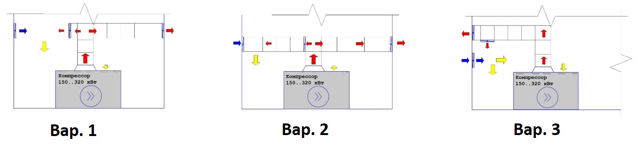 В зависимости от расположения оборудования и особенностей помещения компрессорной станции (см. пример) может потребоваться внесение изменений в типовое решение стандартного комплекта. Например, установка дополнительных элементов воздуховода или объединение воздуховодов.