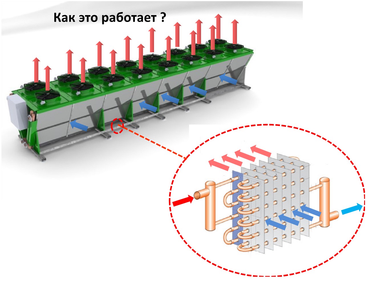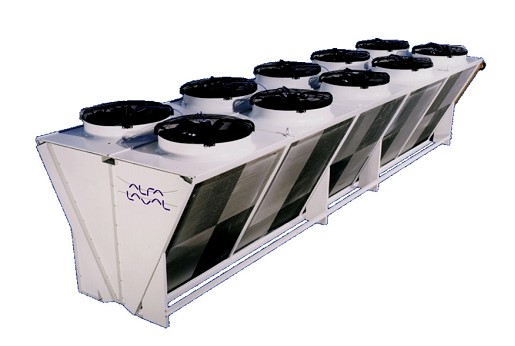 продуваемый осевыми вентиляторами. Жидкость циркулирует по трубам и охлаждается потоком воздуха.